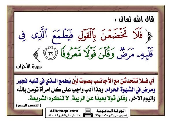 Younes Al Salman On Twitter قال تعالى فلا تخضعن بالقول فيطمع الذي في قلبه مرض وقلن قولا معروفا سورة الأحزاب آية 32 Quran Woman Islamic