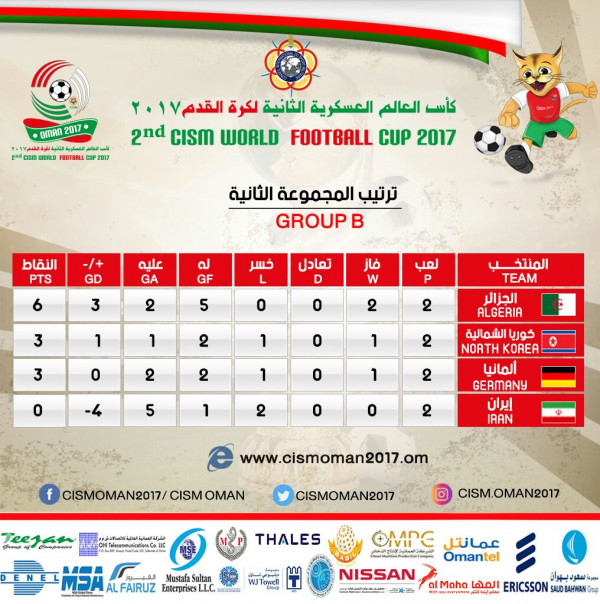 المنتخب الوطني كأس العالم العسكرية ترتيب مجموعة الجزائر بعد نهاية مباريات الجولة 2